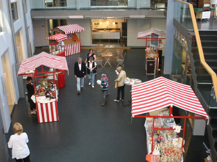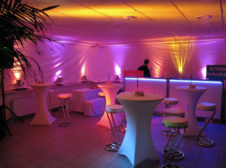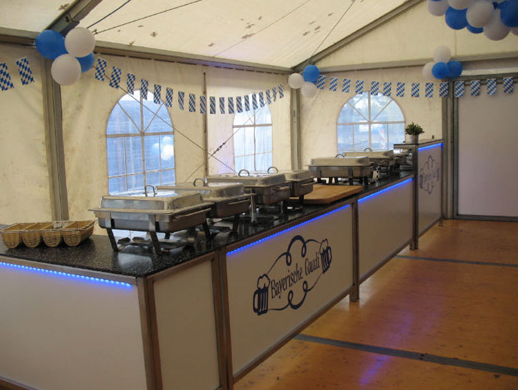 - Essens- und Getränkestände können mit beleuchteten Theken und Event-Dekoration gebucht werden