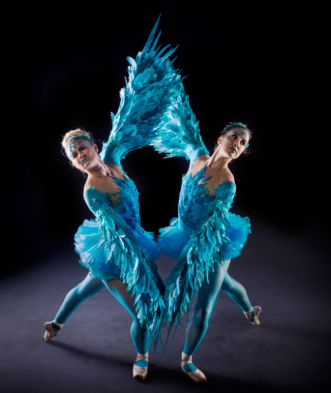 Gekleidet in klassische Tüll-Tutus, verziert mit glitzernden Kristallen, Federn und Rüschen in einem auffälligen Tiefblau, verwandeln sich unsere Balletttänzerinnen in vogelähnliche Kreaturen, inspiriert von dem ikonischen Schwanensee. Ihre avantgardistischen Kostüme werden durch große gefiederte Flügel vervollständigt, die sich bei jeder Armbewegung anmutig bewegen.