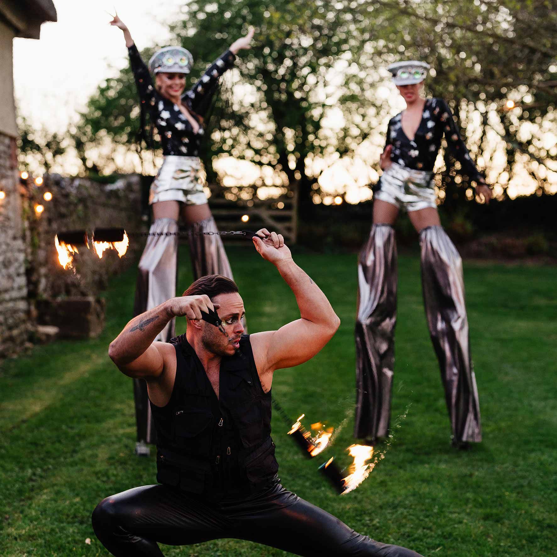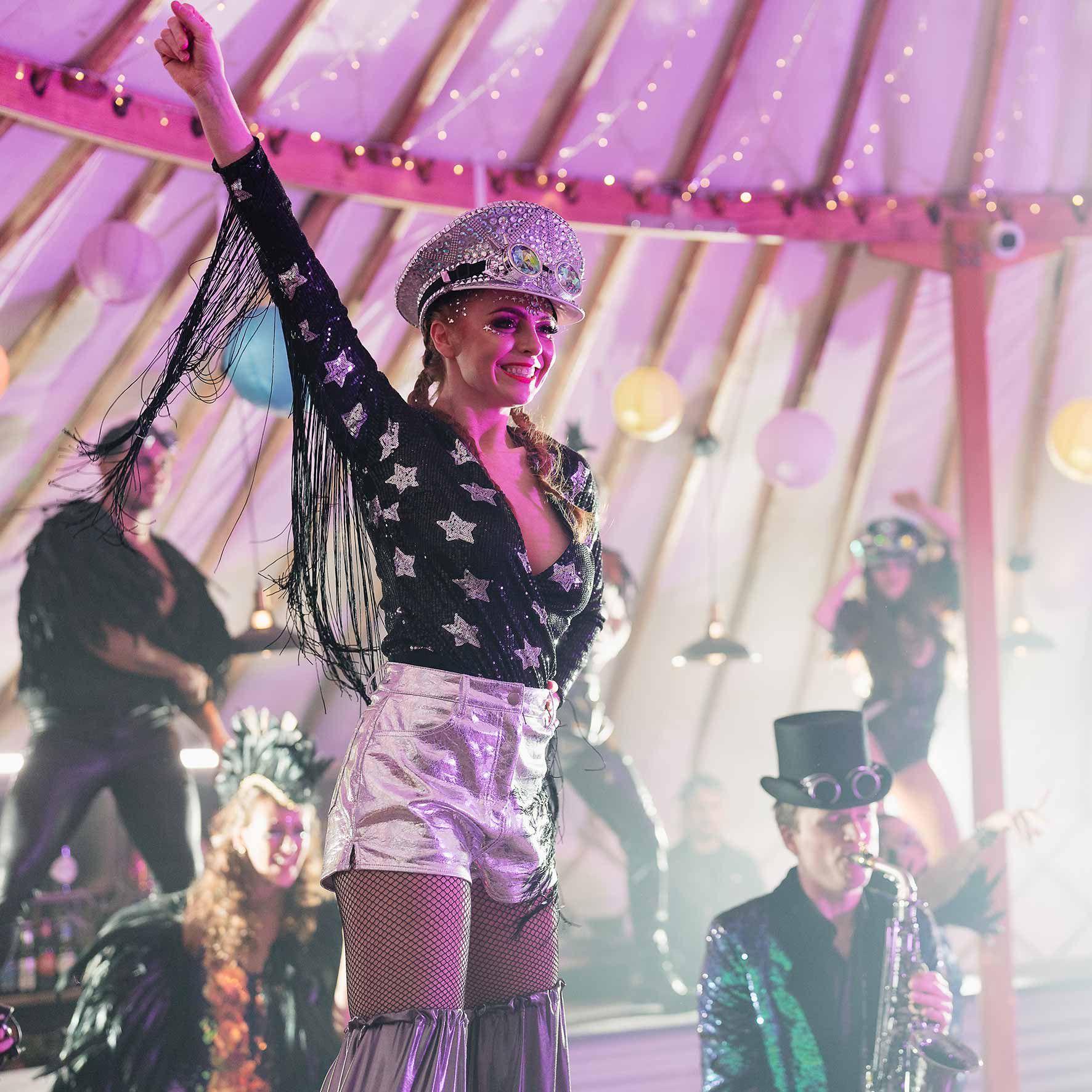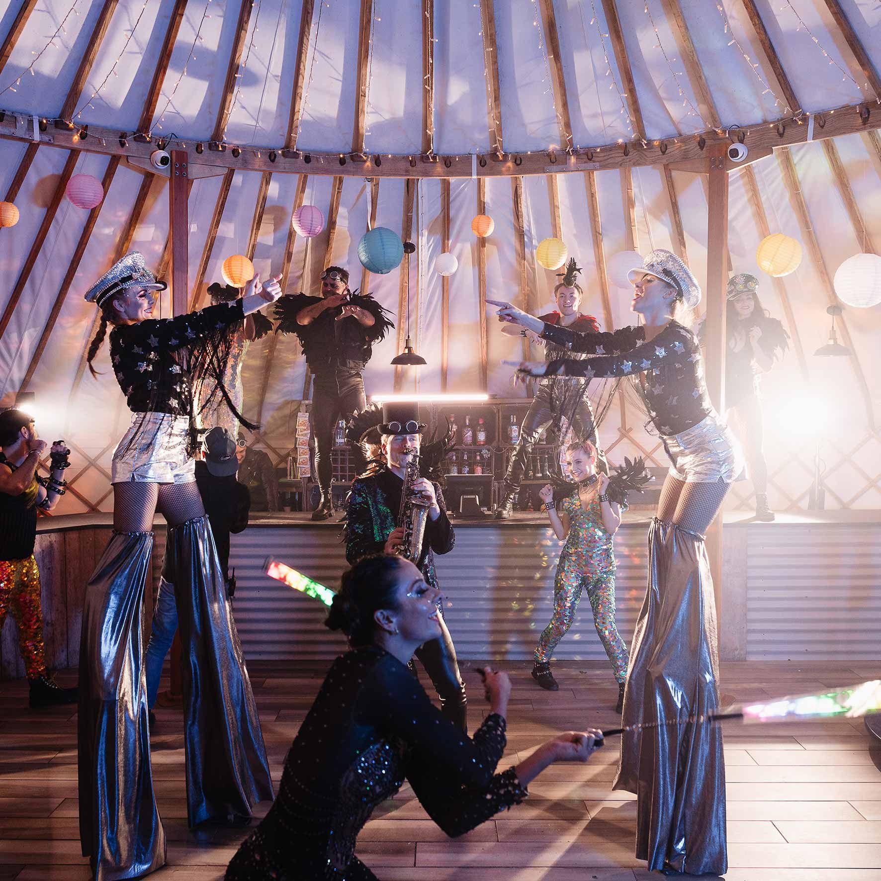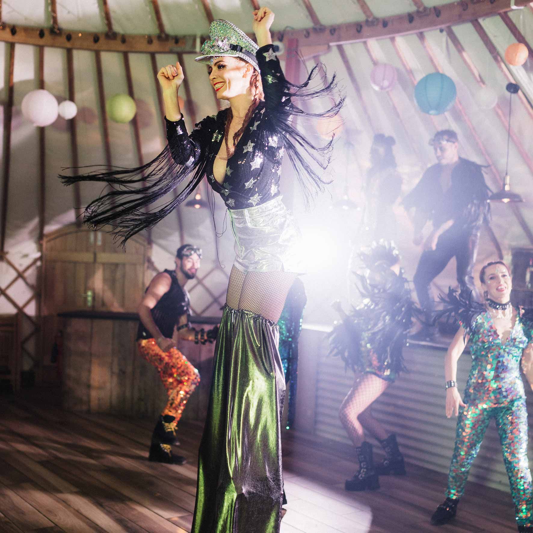 Später am Abend werden unsere Stelzenläufer die Gäste dazu ermutigen, auf die Tanzfläche zu gehen, indem sie ihre beeindruckenden Moves zeigen und mit den Gästen interagieren.