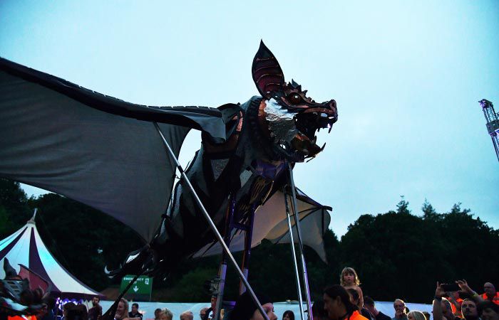 Dieser umherstreifende Fantasy-Feuer speiende Fledermaus-Puppe ist ein absoluter Publikumsmagnet und ein spektakuläres pyrotechnisches Schauspiel, das man gesehen haben muss.