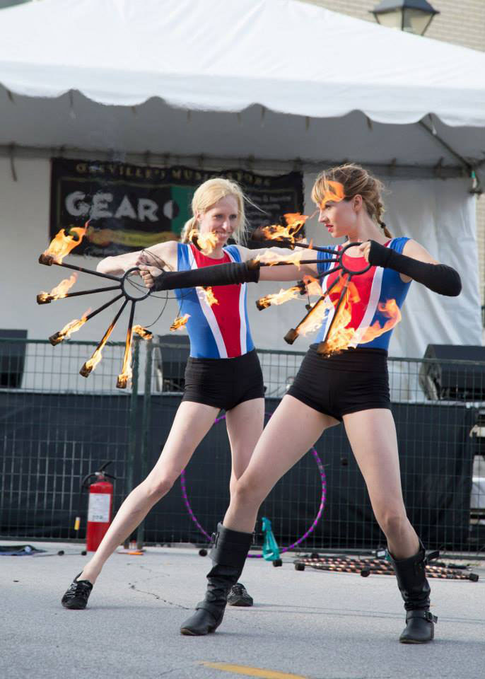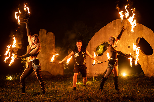 Mit Feuerspinnen, Poi, Feuerreifen, Jonglieren, Feuerfächern, Feueressen, Feuerspucken und mehr bieten die wagemutigen Künstler auch eine spektakuläre 20-minütige Option, bei der alle Künstler auftreten und ihre besten Feuerfähigkeiten präsentieren.