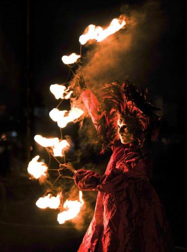 Kostümierte inszenierte Feuerpyrotechnikshow.