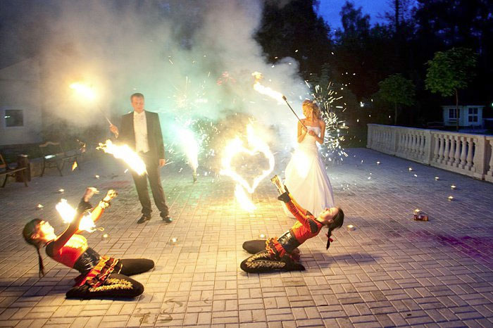 Das Hochzeitsprogramm beinhaltet eine Interaktion mit dem Brautpaar und den Gästen (Herz, Fontänen, "Feuerringe").