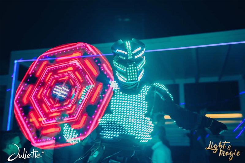 In LED-Anzügen gekleidet, bieten unsere fantastischen Künstler unglaublich auffällige Event-Unterhaltung, indem sie Laserstrahlen um sich herum manipulieren, um eine visuell spektakuläre Live-Bühnenshow zu kreieren. Mit LED-Poi und vielen Spezialeffekten bietet diese einzigartige Produktion die neueste Laser-Technologie in einer bahnbrechenden Performance, die Musik und Licht kombiniert, um ein einzigartiges Erlebnis für Ihre Gäste zu schaffen. Ein Laser-Musiker dirigiert sowohl den Klang als auch die Bilder über seine maßgeschneiderte Kontrollstation.