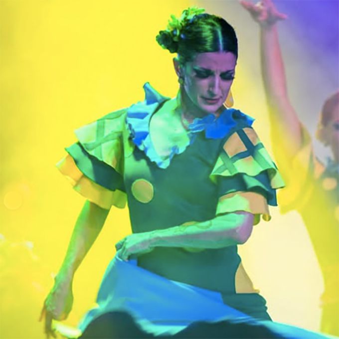 Mit Ausbildung in Choreographie, Zirkuskunst und Akrobatik bringt sie dynamische Bewegung und unerwartete Schichten in ihre Flamenco-Aufführung.