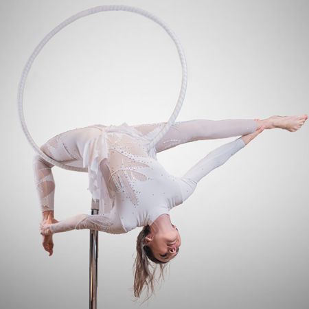 Elegant und anmutig bei jeder Bewegung ist unser Freistehender Aerial-Hoop-Künstler eine wunderschön anspruchsvolle Darbietung, die für alle Anlässe geeignet ist.