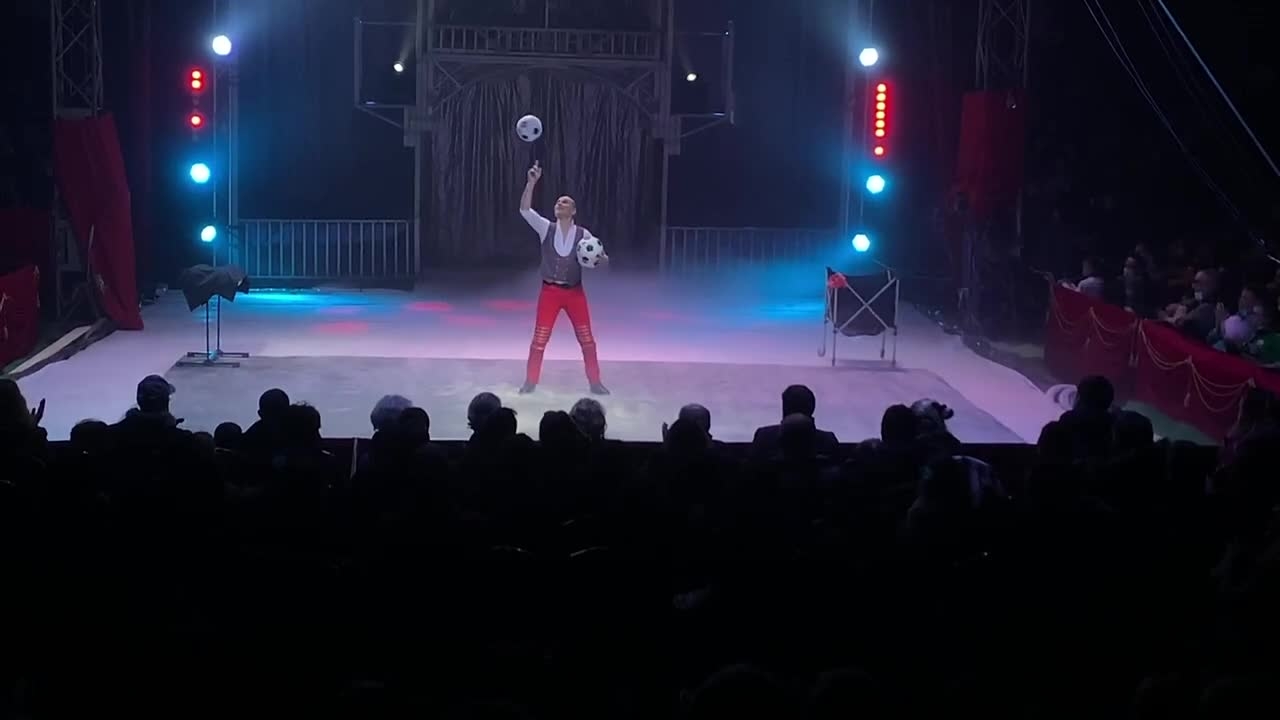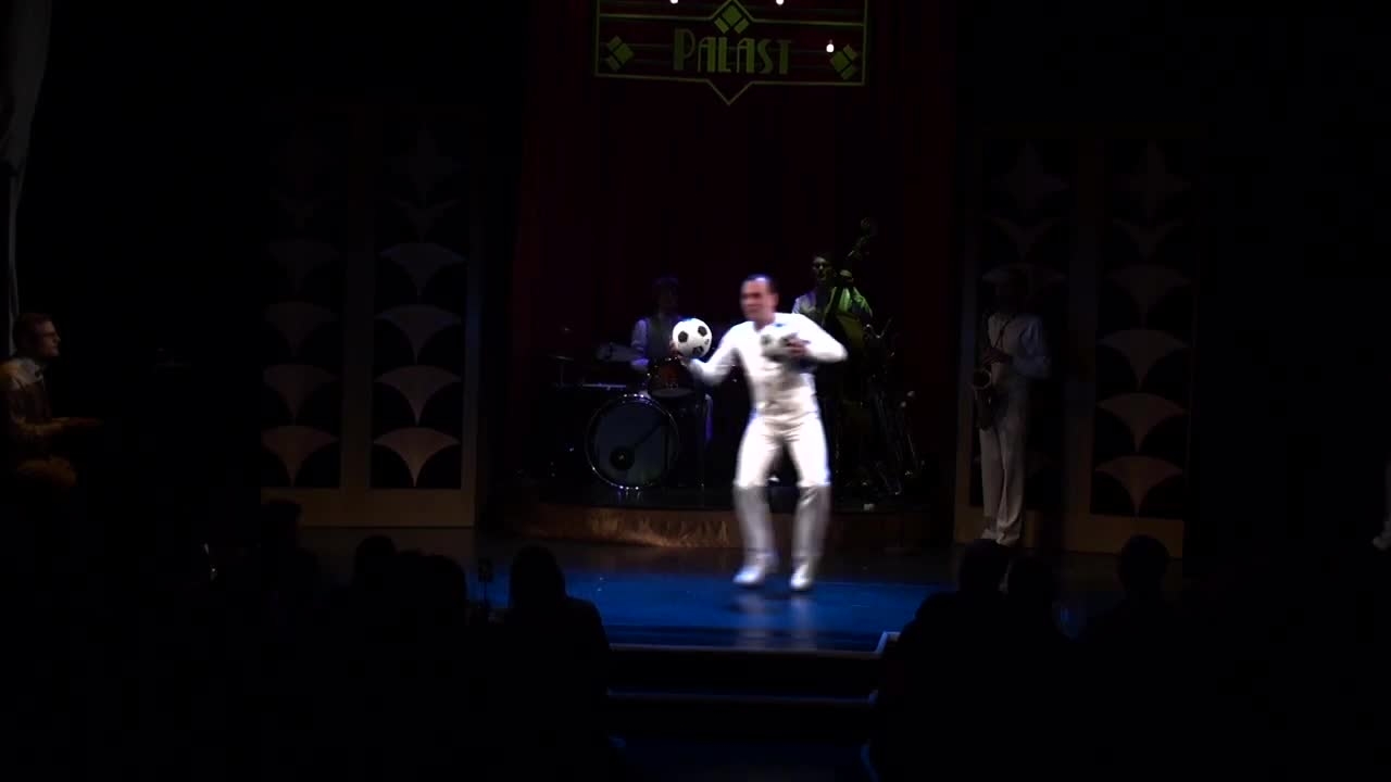 Er jongliert mit verschiedenen Sportbällen, darunter Fuß- und Basketbälle, für eine unterhaltsame Varietéshow, die mit Charisma und künstlerischem Flair glänzt.