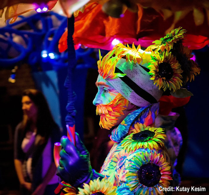 Das erstaunliche Kostüm der wandernden Dame zeigt Motive aus Claude Monets Mohnfeld, während das atemberaubende Outfit unseres Herren eine Kombination aus Vincent Van Goghs Sternennacht und Sonnenblumen ist. Die Kostüme sind mit austauschbaren LED-Lichtern ausgestattet, die ständig das Erscheinungsbild der Farben verändern, während die Regenschirme UV-Licht auf die Figuren werfen und so einen auffälligen fluoreszierenden Glanz erzeugen, der von überall aus sichtbar ist.
