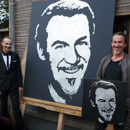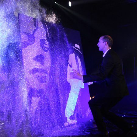 Jedes Stück ist originell und individuell für Ihre Veranstaltung gestaltet. Erik führt seine Routine in nur wenigen Minuten zur Verblüffung des Betrachters durch. Kleber und Glitzer, Farbe und andere Materialien auf schwarzem oder weißem Leinwandstoff werden für alle Arten von Grafiken verwendet, einschließlich Porträts, Bilder, Logos, Formen, Objekte, Fahrzeuge, architektonische Elemente usw., um das Publikum bei seinen Shows zu überraschen.