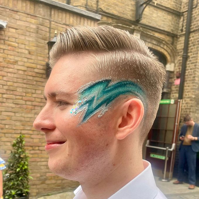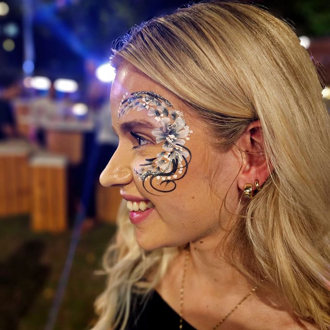 Beim Durchstreifen Ihrer Veranstaltung bieten sie wunderschöne Glitzer-Augendesigns an, die zu den Outfits Ihrer Gäste passen und dabei den feinsten biologisch abbaubaren Glitzer verwenden.