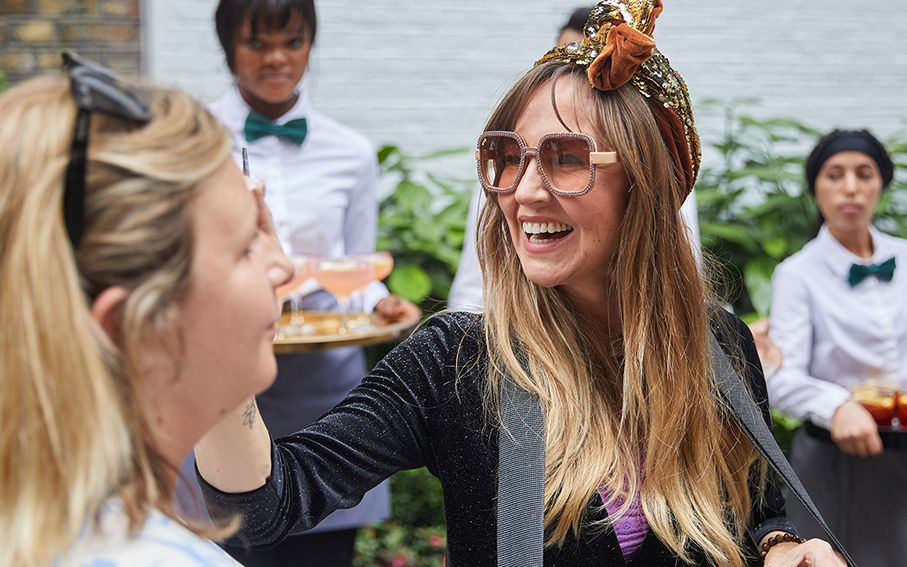 Gekleidet in auffälligen Pailletten- oder Vintage-Kostümen haben die Usherettes Glitzer-Tablett-Sets bereit, um Ihre Gäste mit Glitzer zu bemalen.