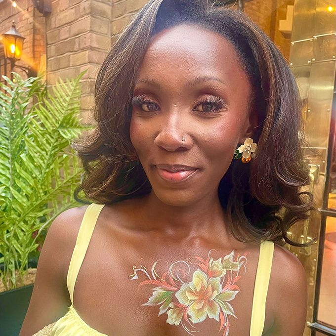 Kann auch Festival-Stil Gesichtskunst mit Juwelen und Glitzer oder zarten Blumen, UV- und Henna-Kunst enthalten.