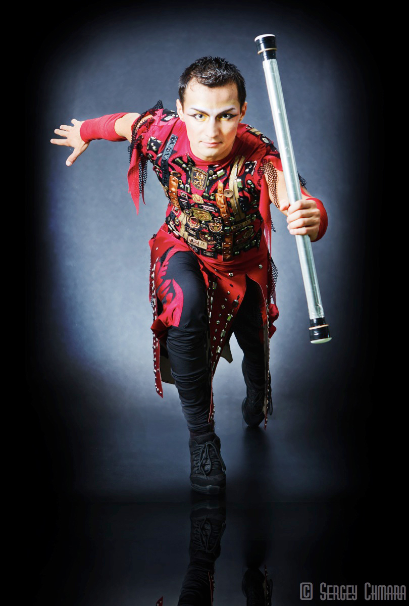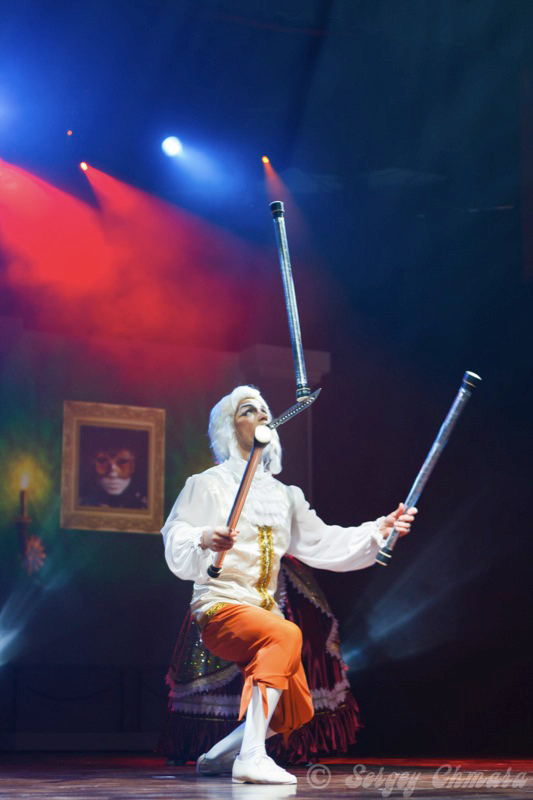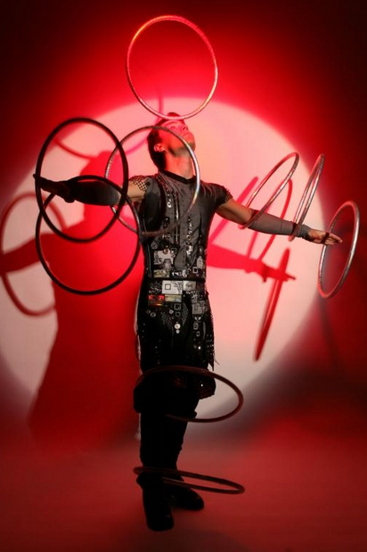 Gleichzeitig dreht Valerii zusätzliche Ringe um seine Arme und Beine. Selbst der kritischste Zuschauer ist völlig überzeugt, wenn Valerii die langen Stöcke mit Mund und Händen hoch über den Köpfen des staunenden Publikums jongliert. Diese Nummer ist der absolute Höhepunkt jeder Show!