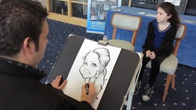 Mickey kann an einer festen Staffelei arbeiten und etwa 20 Schwarz-Weiß-Karikaturen pro Stunde oder 10-12 in Farbe erstellen. Alternativ bietet er auch einen exzellenten Rundgang-Service an, bei dem er sich unter die Gäste mischt und mit ihnen interagiert. Er wird jeden Probanden fragen, ob er eine geschmackvollere oder übertriebenere Karikatur bevorzugt, damit jeder das gewünschte Porträt erhält.