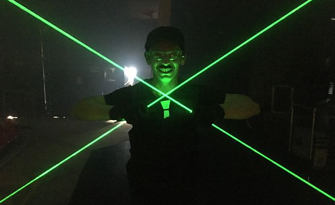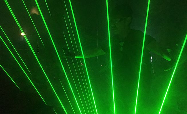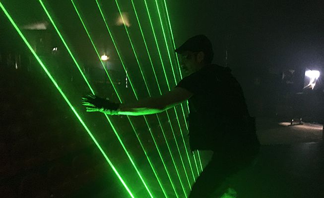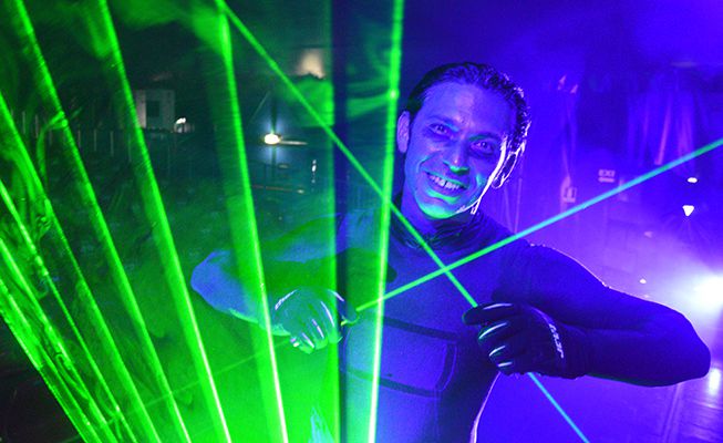 Diese Laser-Show bringt eine futuristische Atmosphäre in Veranstaltungsorte, mit einem schwarzen Jumpsuit-Kostüm und perfekt synchronisierten Lasern im Einklang mit der Musik.