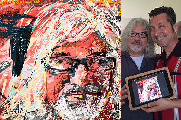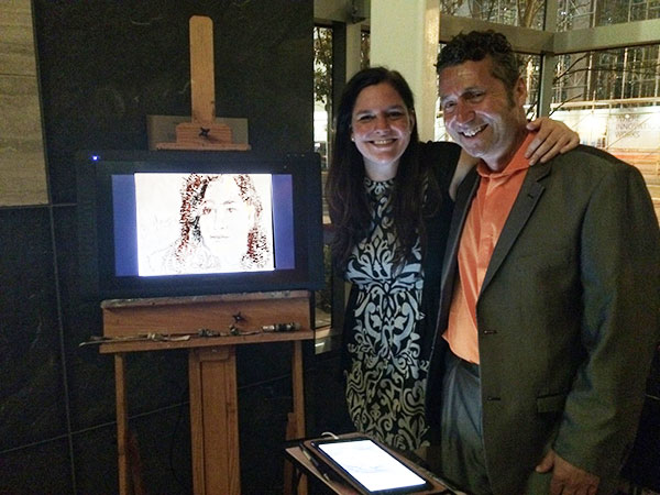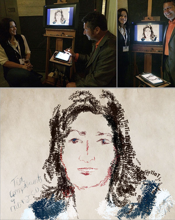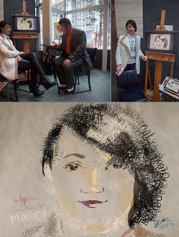 Seine Kunstwerke entstehen mit einem speziellen, hochmodernen druckempfindlichen Stift und der neuesten digitalen Maltechnologie. Seine Ausrüstung kann je nach Kundenwunsch von einem Mac-Computer bis hin zu einem iPad oder einem anderen Gerät oder einer Plattform variieren. Er zeichnet und malt direkt nach Beobachtung seines Motivs mit traditioneller künstlerischer Hand-Augen-Koordination. Jedes skizzierte Porträt dauert in der Regel etwa zehn Minuten und fängt die Persönlichkeit und Essenz des Gastes in einer originalen, handgemalten, feinen Kunstzeichnung ein, die dann nach Fertigstellung an die betreffende Person per E-Mail gesendet werden kann.