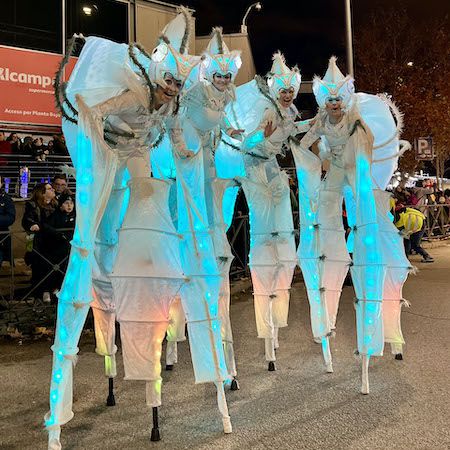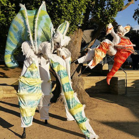 Die Aufstellung umfasst bis zu sieben Charaktere, eine Mischung aus Stelzen- und bodenbasierten Künstlern, die herumlaufen, mit Gästen interagieren und Tanzroutinen aufführen.