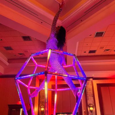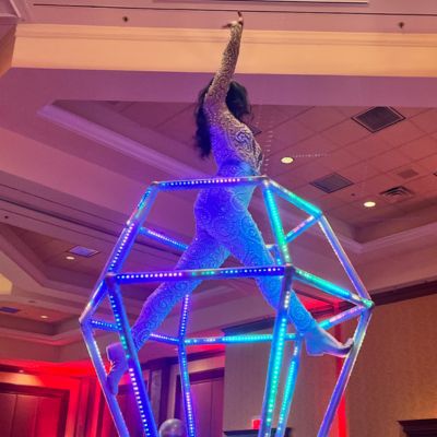 Erzeugen Sie ein atemberaubendes Spektakel mit einem Künstler, der in einem leuchtenden LED-Diamanten schwebt und das Publikum bei jedem gehobenen Event fesselt.