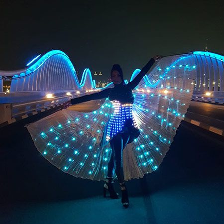 Obwohl normalerweise für Abend- und Nachtveranstaltungen empfohlen, um eine größere visuelle Wirkung zu erzielen, kann diese Lichttanzshow auch für Veranstaltungen tagsüber gebucht werden. Dies liegt daran, dass die Flügel, die unsere weiblichen Lichtkünstlerinnen tragen, extrem hell sind und auch bei Tageslicht gut sichtbar sind.
