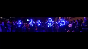 Eine energiegeladene, High-Tech-Show für Auftritte bei schwachem Licht oder nachts. Diese Gruppe von Tänzern trägt Kostüme, die mit programmierbaren LED-Lichtern beleuchtet sind.