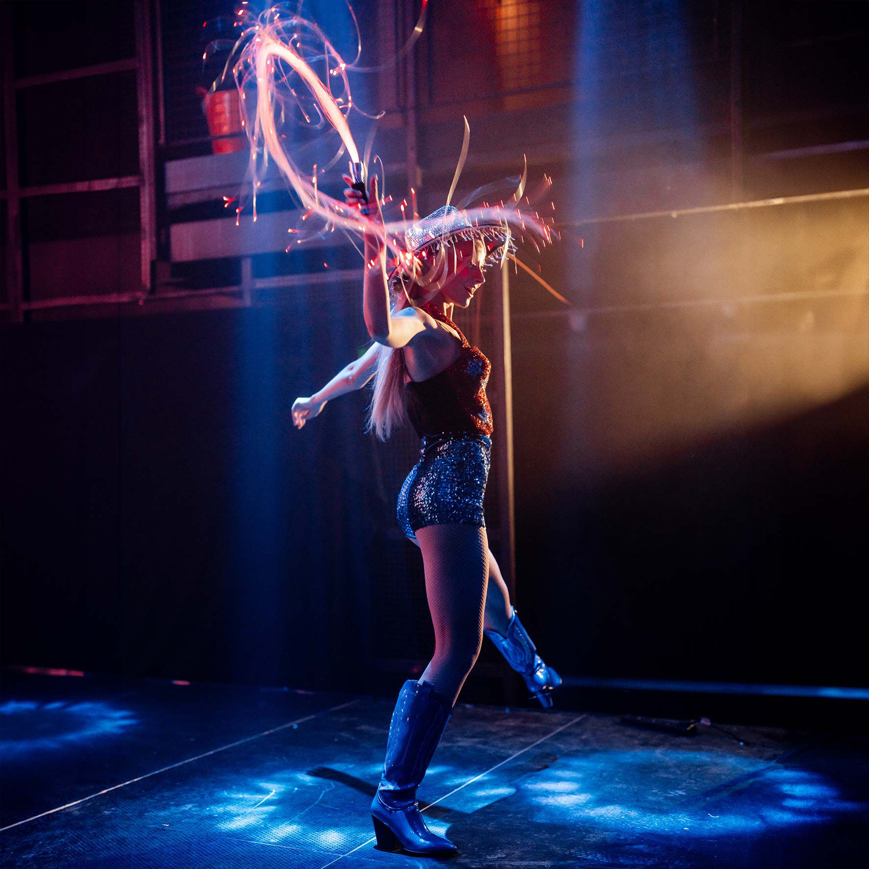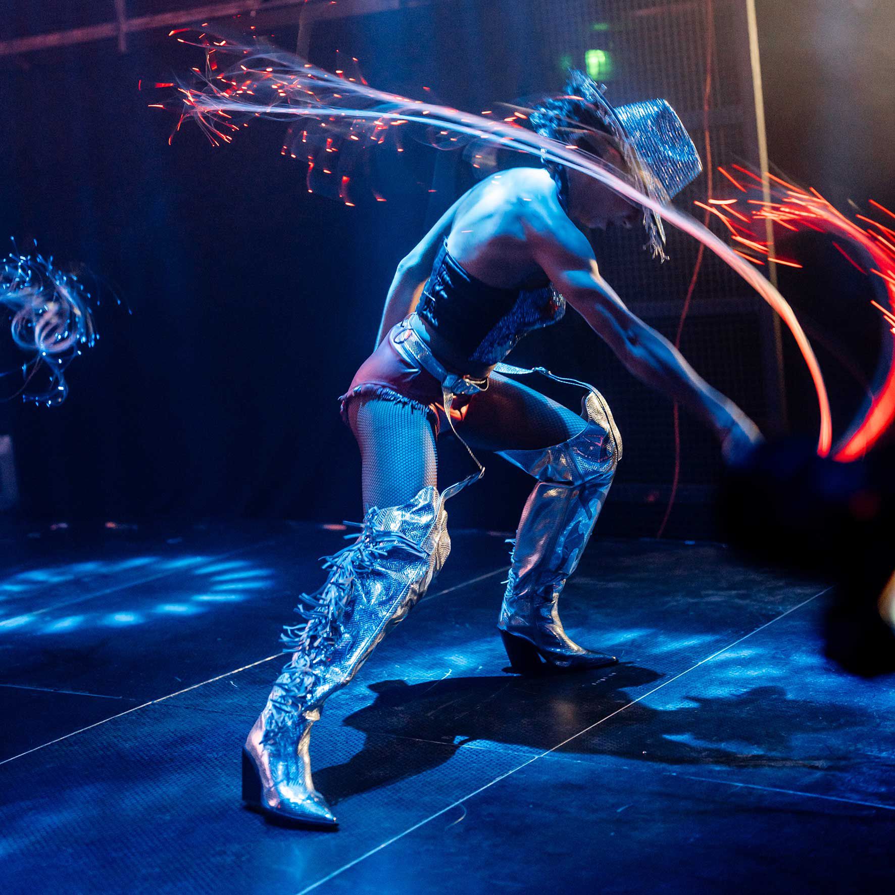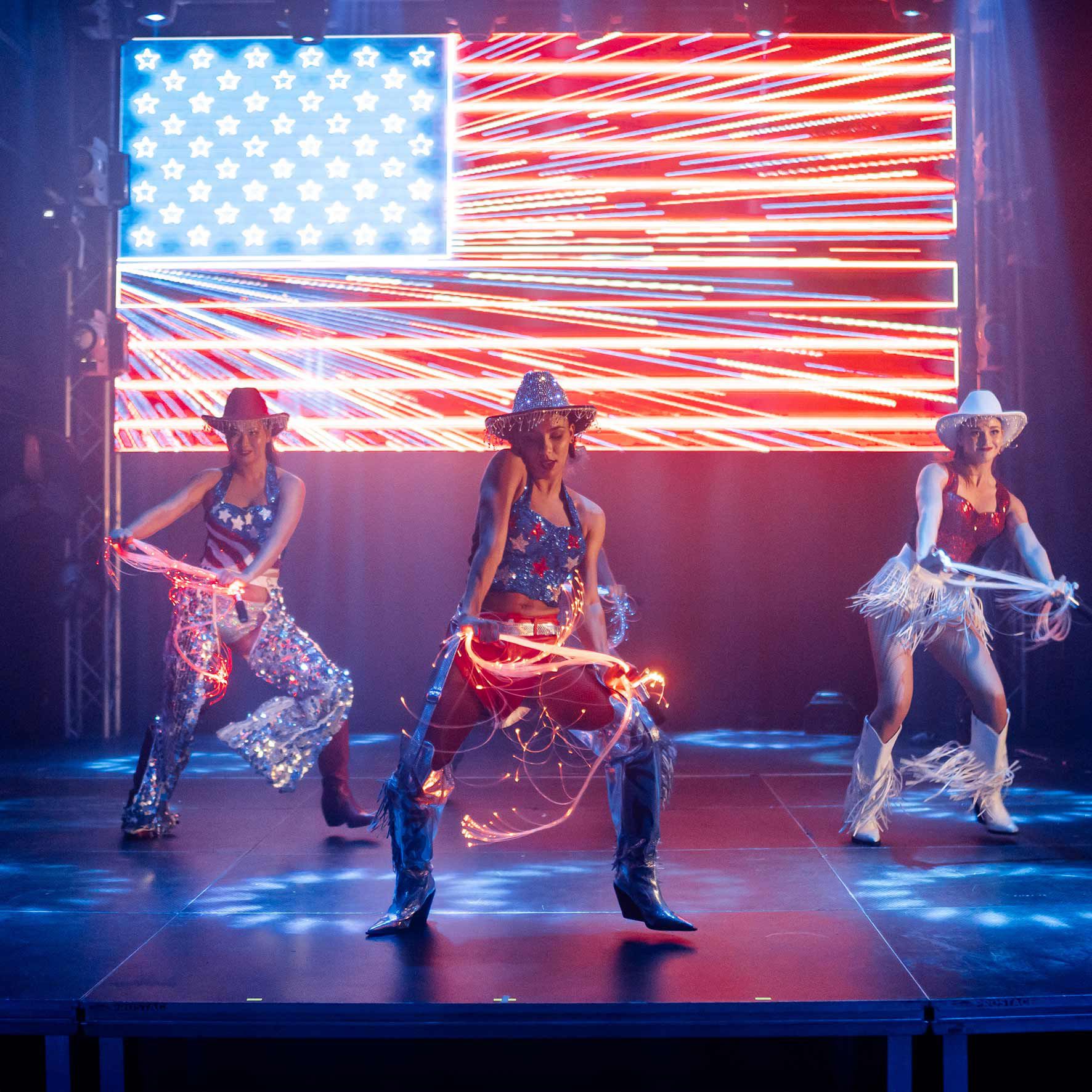 Unsere Gruppe talentierter Tänzer führt choreografierte Routinen mit LED-Peitschen auf, um eine spaßige Variante der traditionellen Country-Unterhaltung zu bieten.