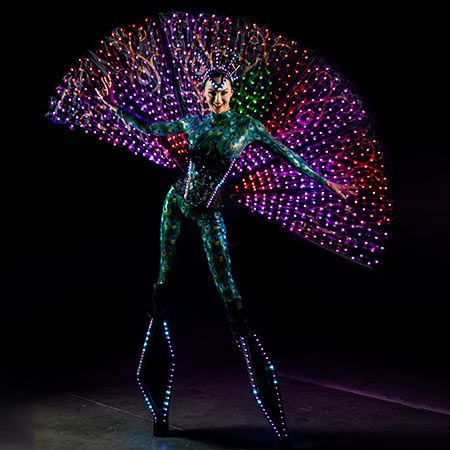 Dieser beeindruckende Stelzenakt nutzt pulsierende LED-Lichter in einer Vielzahl von Farben, um einen Pfauen-Schwanz zu erzeugen, der zu schimmern scheint, während sie sich bewegen.