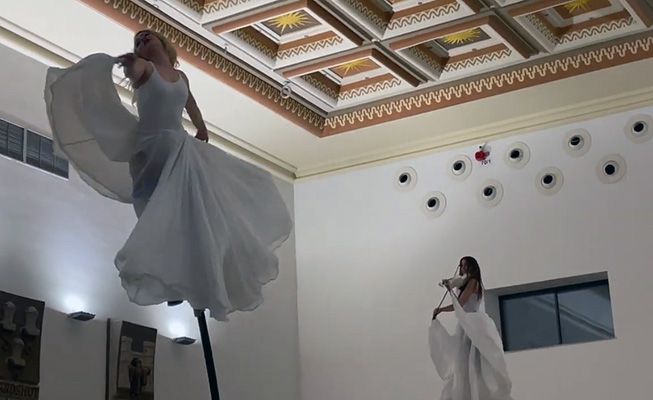 Eine einzigartige Luftshow mit einem Soloviolinisten und einem Zirkuskünstler, der zur Musik der Violine auftritt.