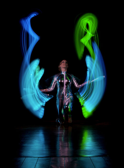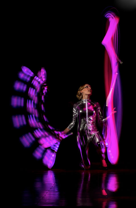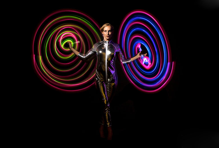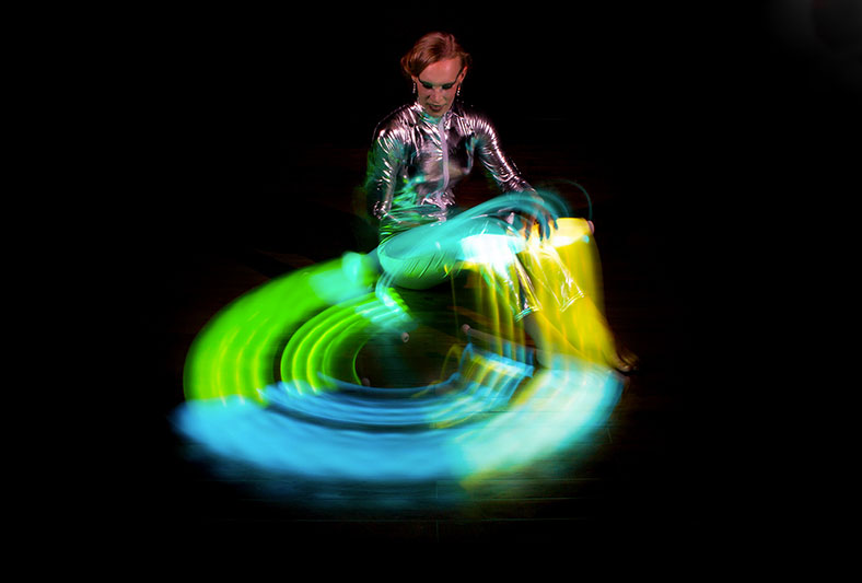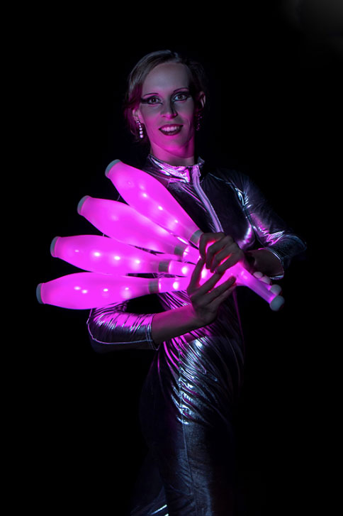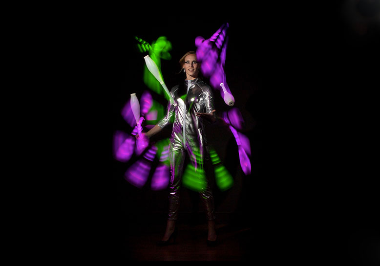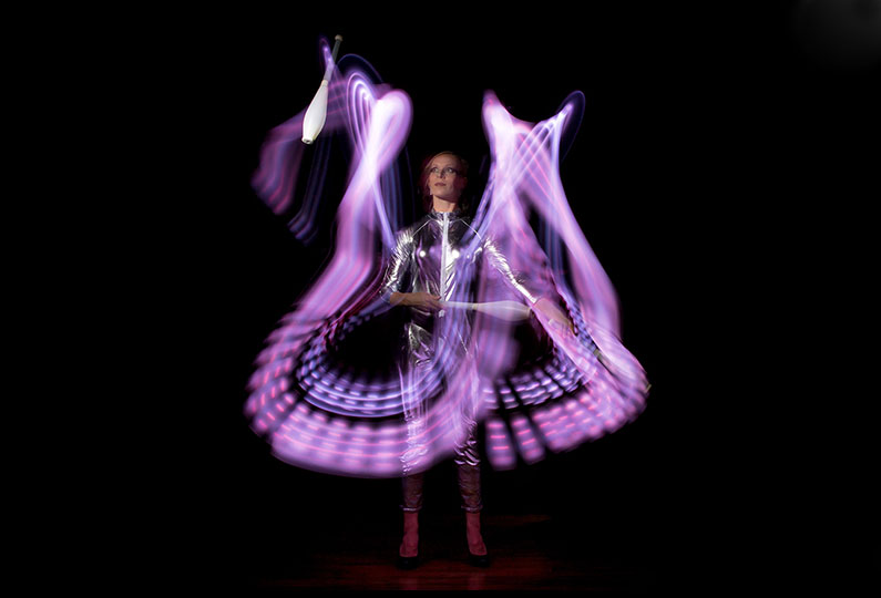 Mit großer Geschicklichkeit und Schnelligkeit bewegt sich diese talentierte Künstlerin über die Bühne und kombiniert verschiedene Elemente und Disziplinen. Das Publikum wird die lebendigen und beeindruckenden fluoreszierenden Lichteffekte und Formen ihrer Performance genießen.