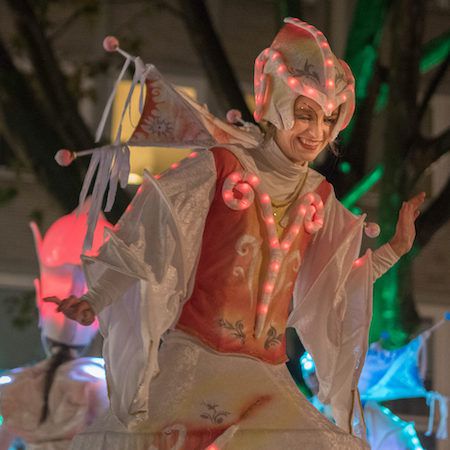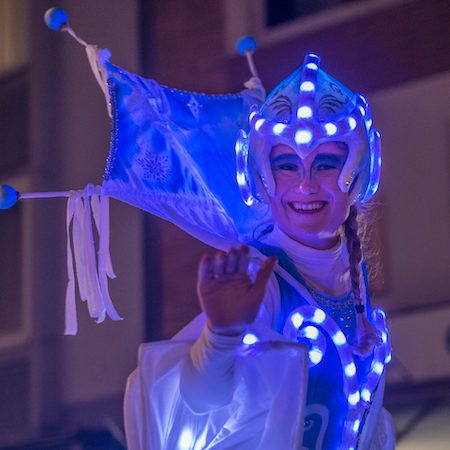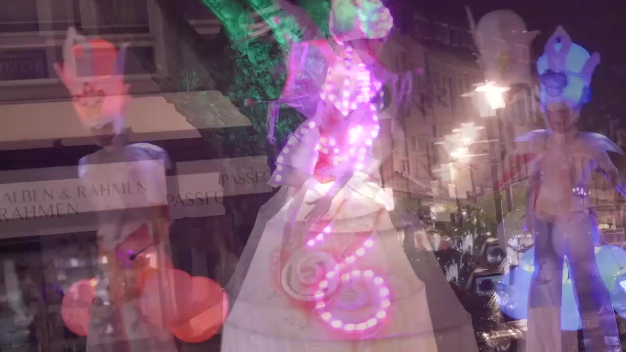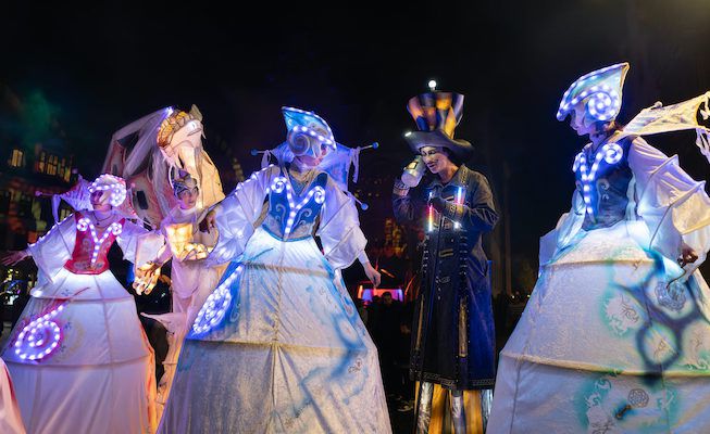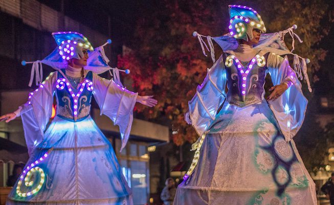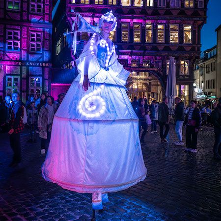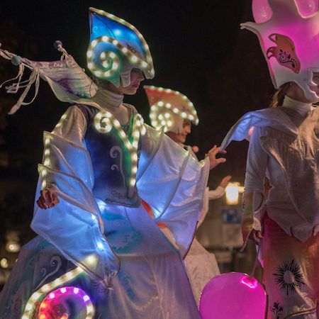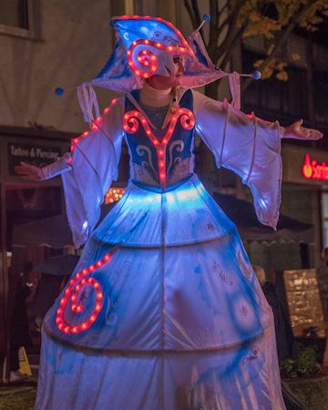 Diese Stelzenfiguren durchstreifen Menschenmengen, tragen beleuchtete Kopfbedeckungen und hohe Kleider mit Spiralen und leuchtenden Linien, die nachts wunderschön leuchten.