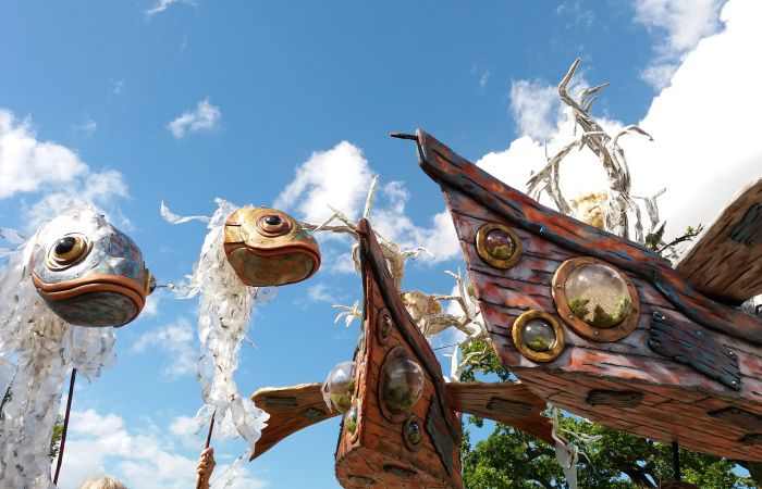Schauen Sie staunend zu, wie unsere Piraten-Puppenspieler ihre prächtigen fliegenden Schiffe durch das Publikum manövrieren, gefolgt von zwei neugierigen Fischköpfen.