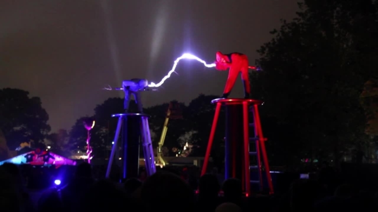 Aus der Dunkelheit kommt das Knistern von Blitzschlägen, die in der Nacht von den beiden Türmen herabstürzen. Zwei Wesen, gekleidet in Metallanzügen, betreten den Bühnenbereich und interagieren mit der Kraft des Blitzes. Sie begeben sich auf eine Entdeckungsreise, klettern auf die Maschine und entdecken, dass sie die Kraft haben, die von riesigen Tesla-Spulen erzeugten Blitzschläge zu lenken.