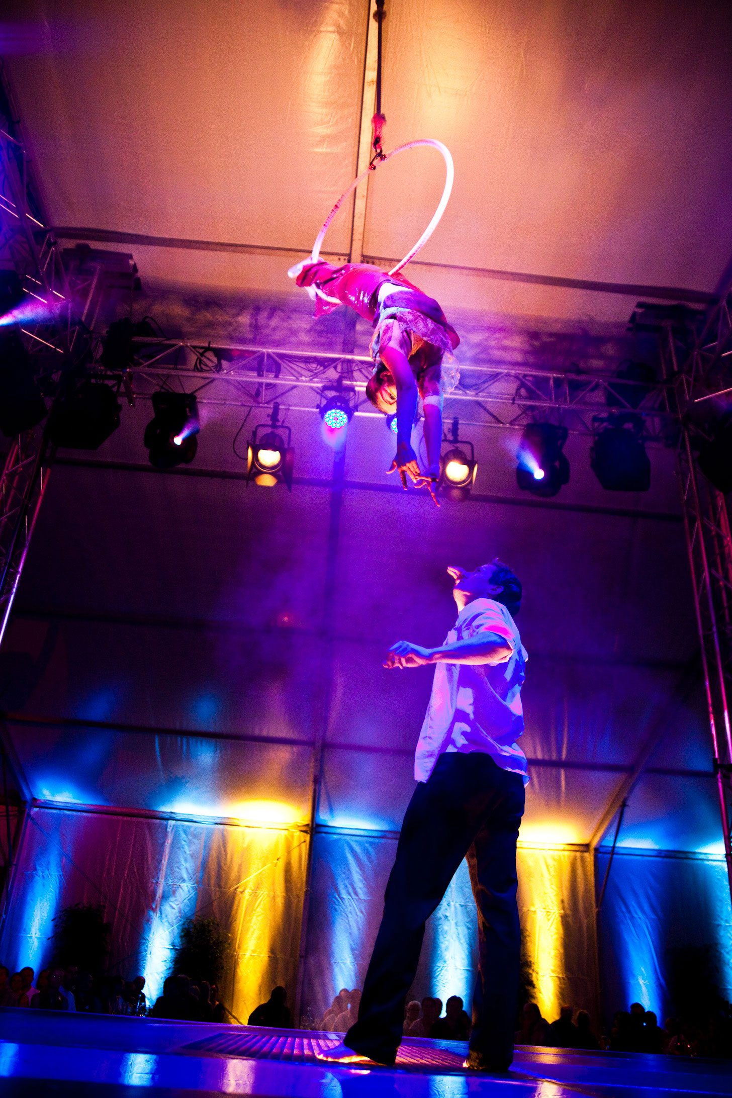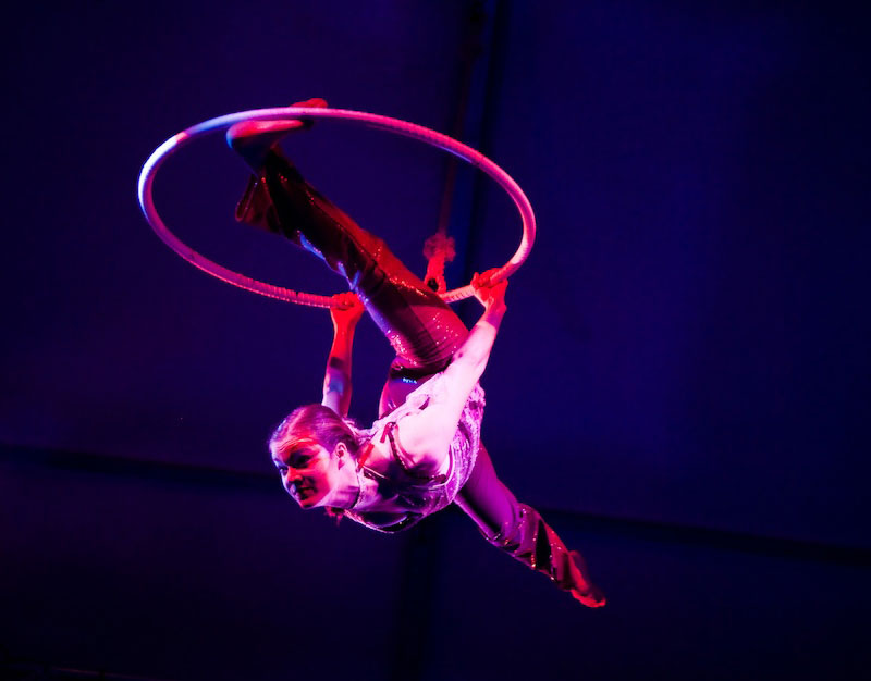 Dies ist eine bezaubernde Luftvorstellung, die die Eleganz, Schönheit und Flexibilität des menschlichen Körpers präsentiert. Mühelos wirbelt jeder Luftakrobat um den Reifen und nimmt elegante Posen ein und vollführt atemberaubende Sprünge. Dies kann als Solo-Auftritt, Duo-Auftritt oder in Kombination mit einem Adagio-Akrobatikpartner aufgeführt werden.