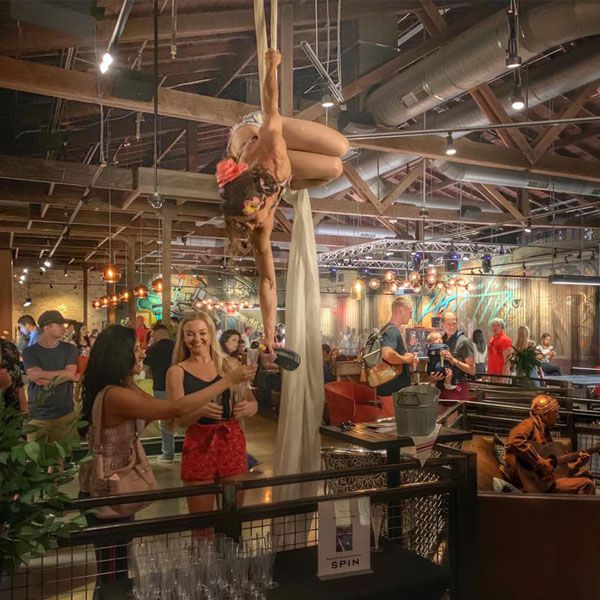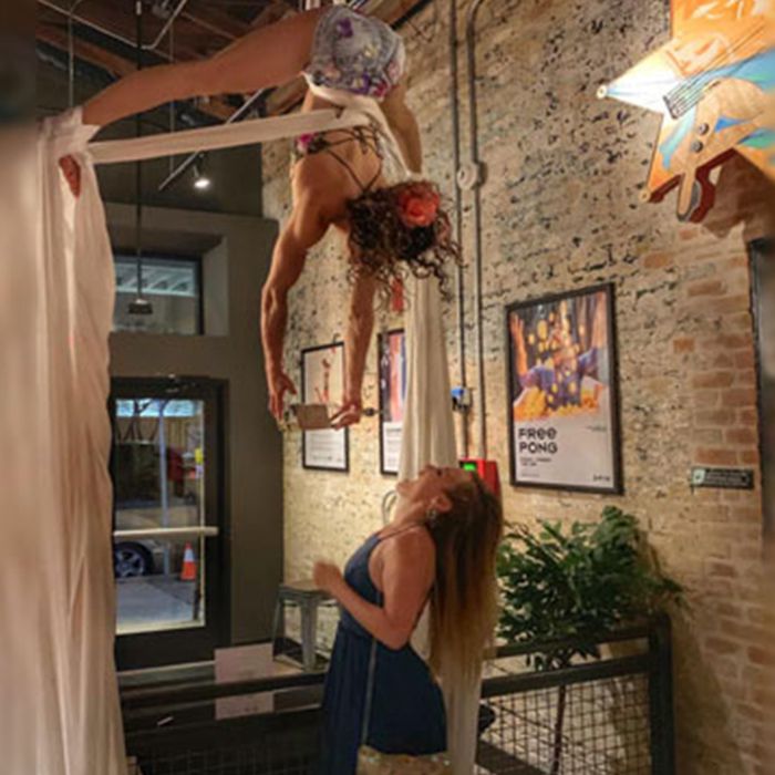 Diese Darbietung ist Teil interaktiver Barkeeper und Teil Luftseiden-Performance. Zwischen den Sets können Sie zuschauen, wie sie verschiedene Routinen durchführt, die sie von einer Pose zur nächsten führen. Ihre Gäste werden die Darbietung unserer Luftakrobatin lieben, wenn sie ihren Körper dehnt, beugt und in interessante Formen verdreht, in denen sie Getränke einschenken kann.