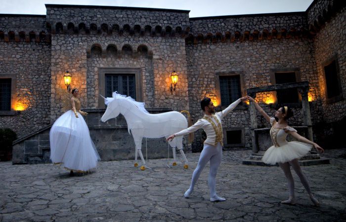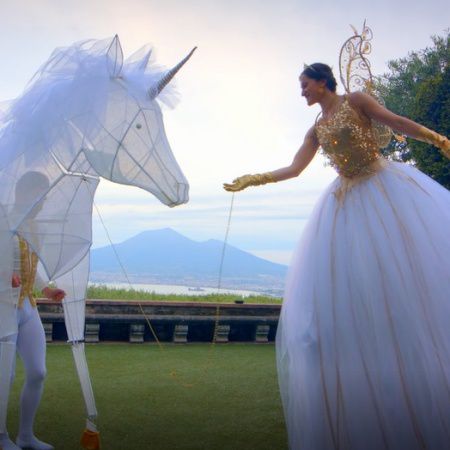 Ein Feen-Stelzenläufer führt ein weißes Einhorn durch die Veranstaltung und enthüllt zwei Balletttänzer, die klassisch-modernen Tanzroutinen aufführen.