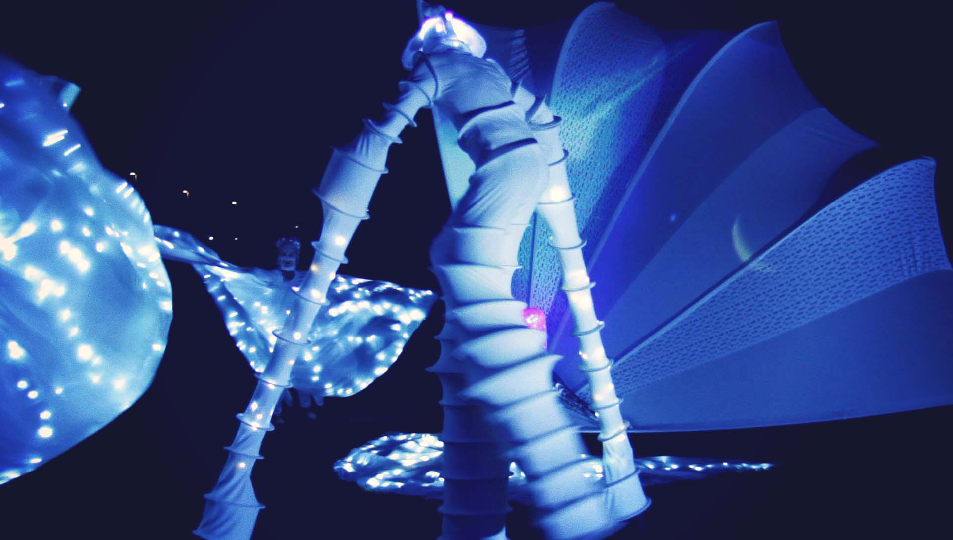 Ausgehend von dem Konzept des Weltraums kommen die weißen, mysteriösen Kreaturen in der Nacht zum Vorschein und können sogar mit funkelnden LED-Lichtern beleuchtet werden. Die wunderschönen weißen Kostüme sind leicht und schweben mühelos, was ihnen ein schlankes Aussehen verleiht. Diese Performance kann mit bis zu 10 Charakteren und vier Stelzenläufern aufgeführt werden und eignet sich für Kunstveranstaltungen, Produktpräsentationen, private Partys und thematische Events.