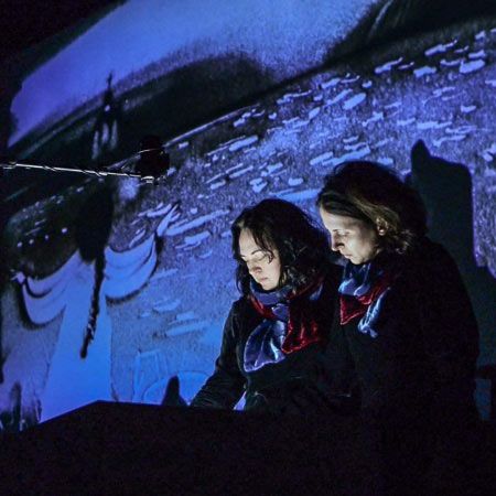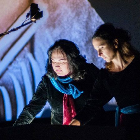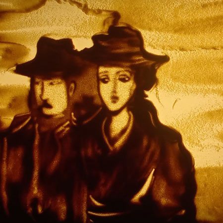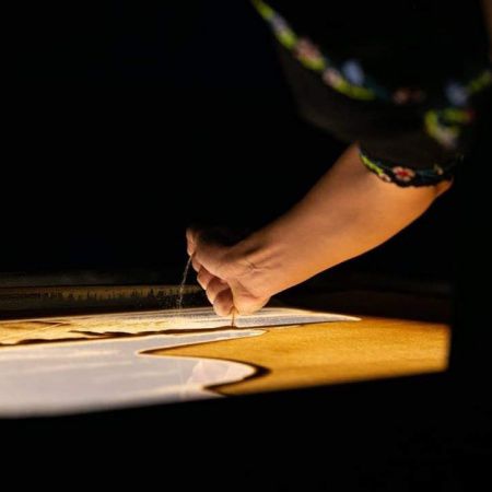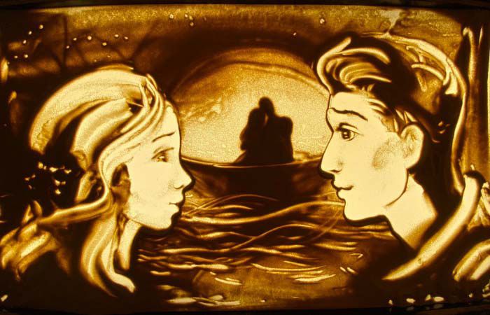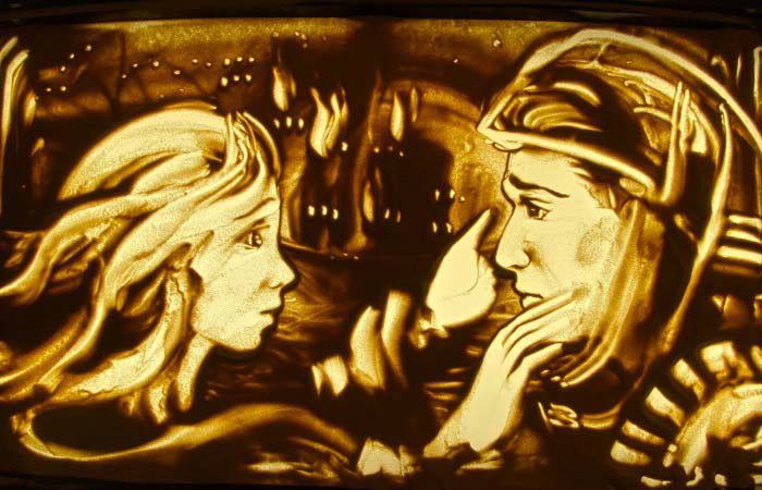 Unser talentiertes Duo arbeitet mit einem Pianisten und einem Geiger zusammen, um Sandanimationen zu erstellen, die geliebte Geschichten begleitet von berühmten Soundtracks darstellen.