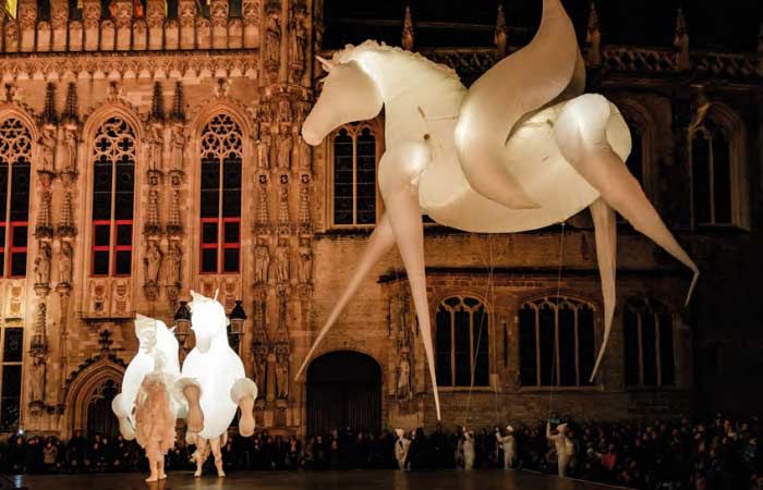 Diese Herde von Pferden, die aus weißen und elfenbeinfarbenen aufblasbaren Materialien besteht, kann in wenigen Minuten aus dem Nichts auftauchen. Beobachten Sie, wie diese magischen Kreaturen durch die Straßen tanzen und fantastische traumhafte Bilder zum Leben erwecken, die von magischen Legenden und Mythen inspiriert sind. Diese einzigartige Darbietung wird von Spezialeffekten wie Beleuchtung, Rauch und ätherischer Musik begleitet und schafft eine magische Atmosphäre, die Zuschauer jeden Alters begeistern wird.