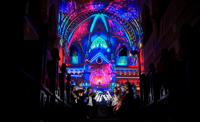 Mit Sitz in Bukarest, Rumänien, kann dieser mit Videomapping projizierte klassische Musikakt in einer Vielzahl von Veranstaltungsorten installiert werden, von Kirchen bis zu modernen Sälen.