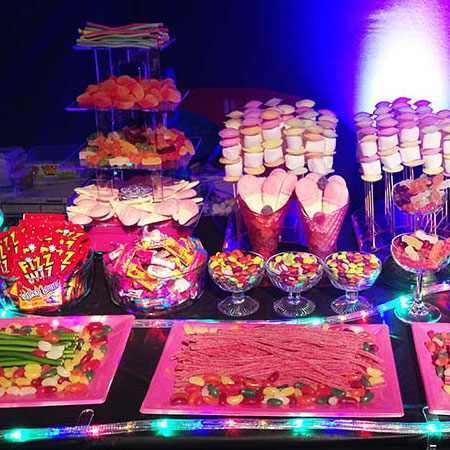 Der leckerste Event-Catering-Service auf der Unterhaltungsszene, dieser Retro-Süßigkeitenstand wird Ihrem besonderen Anlass eine nostalgische Note verleihen. Sie werden vor sich hin kichern, während Sie sich mit Lakritz, Marshmallows, Jelly Beans, Liebesherzen und vielem mehr eindecken. Dieser Süßigkeitentisch lässt Sie sich buchstäblich wie ein Kind in einem Süßwarenladen fühlen. Gehen Sie einfach zum Stand und wählen Sie aus den leckeren Köstlichkeiten aus. Es ist so einfach wie Süßigkeiten von einem Baby zu nehmen - einfacher sogar, weil dabei keine Babys aufgebracht werden!