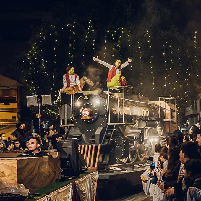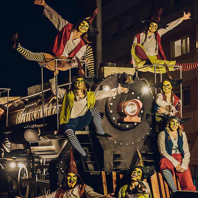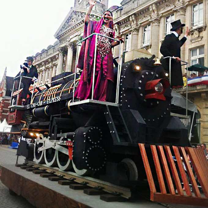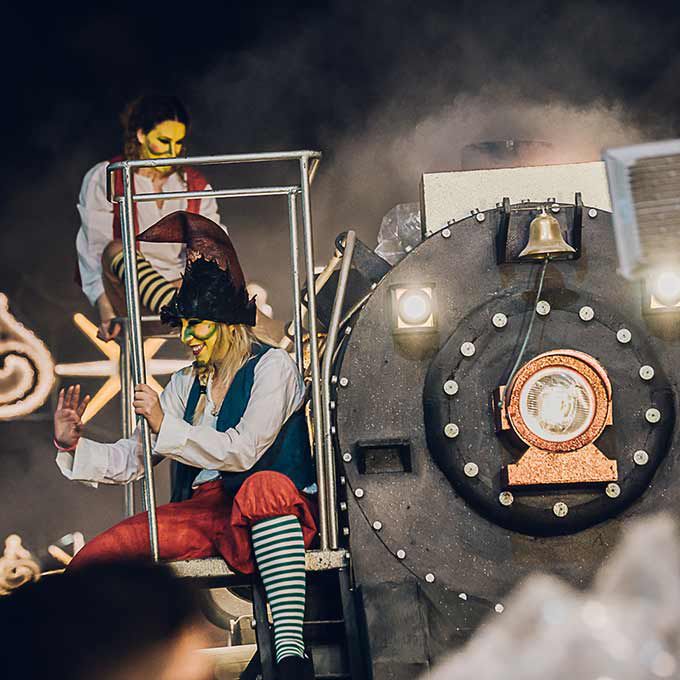 Die riesige bewegliche Zugskulptur ist für große Räume konzipiert und ermöglicht Interaktionen mit Künstlern, Tänzern und Akrobaten.