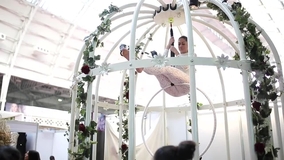 Der Vogelkäfig ist anpassbar und verfügt über farbwechselnde LED-Beleuchtung. Er kann seine floralen Arrangements an Ihr Hochzeitsfarbschema oder Ihre Marke anpassen und das Kostüm des Luftakrobaten im Inneren kann an Ihre Veranstaltung angepasst werden.
