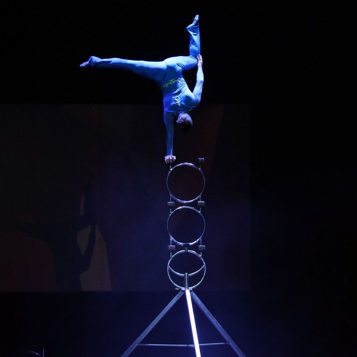 Schauen Sie gespannt zu, wie unser Ringstapel-Balancieract eine Reihe beeindruckender akrobatischer Tricks zeigt, während er auf Ringen balanciert!