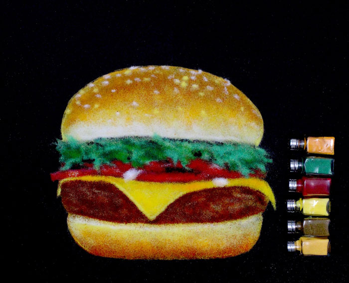 Unser talentierter und vielseitiger Salzkünstler hat Salz als sein bevorzugtes Medium aufgrund seiner Ausdruckskraft und Einzigartigkeit ausgewählt. Indem er sein eigenes Salz mit Lebensmittelfarben-Tinte färbt, schafft er dramatische Bilder, indem er eine schwarze Schaumstoffplatte als Hintergrund verwendet.