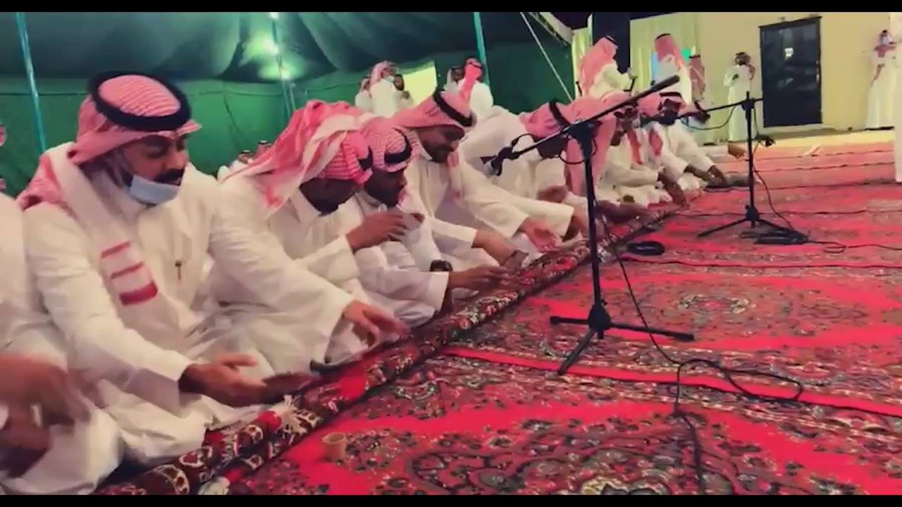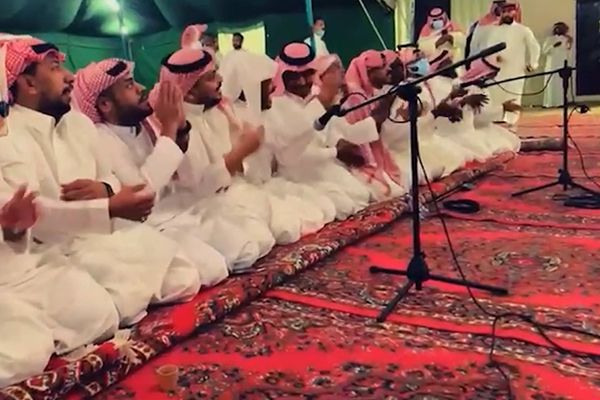 Diese authentische Najdi-Kulturaufführung zeigt Künstler, die in Reihen sitzen oder stehen und traditionelle Poesie im Wechselgesangsstil singen.