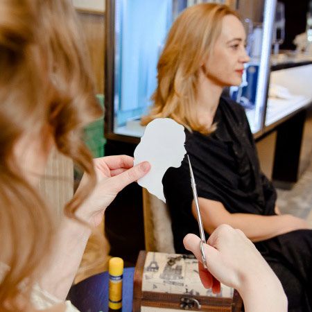 Unser professioneller Künstler für Live-Veranstaltungen verwendet nur eine Schere und Papier, um in nur wenigen Minuten wunderschöne maßgeschneiderte Silhouetten zu erstellen.