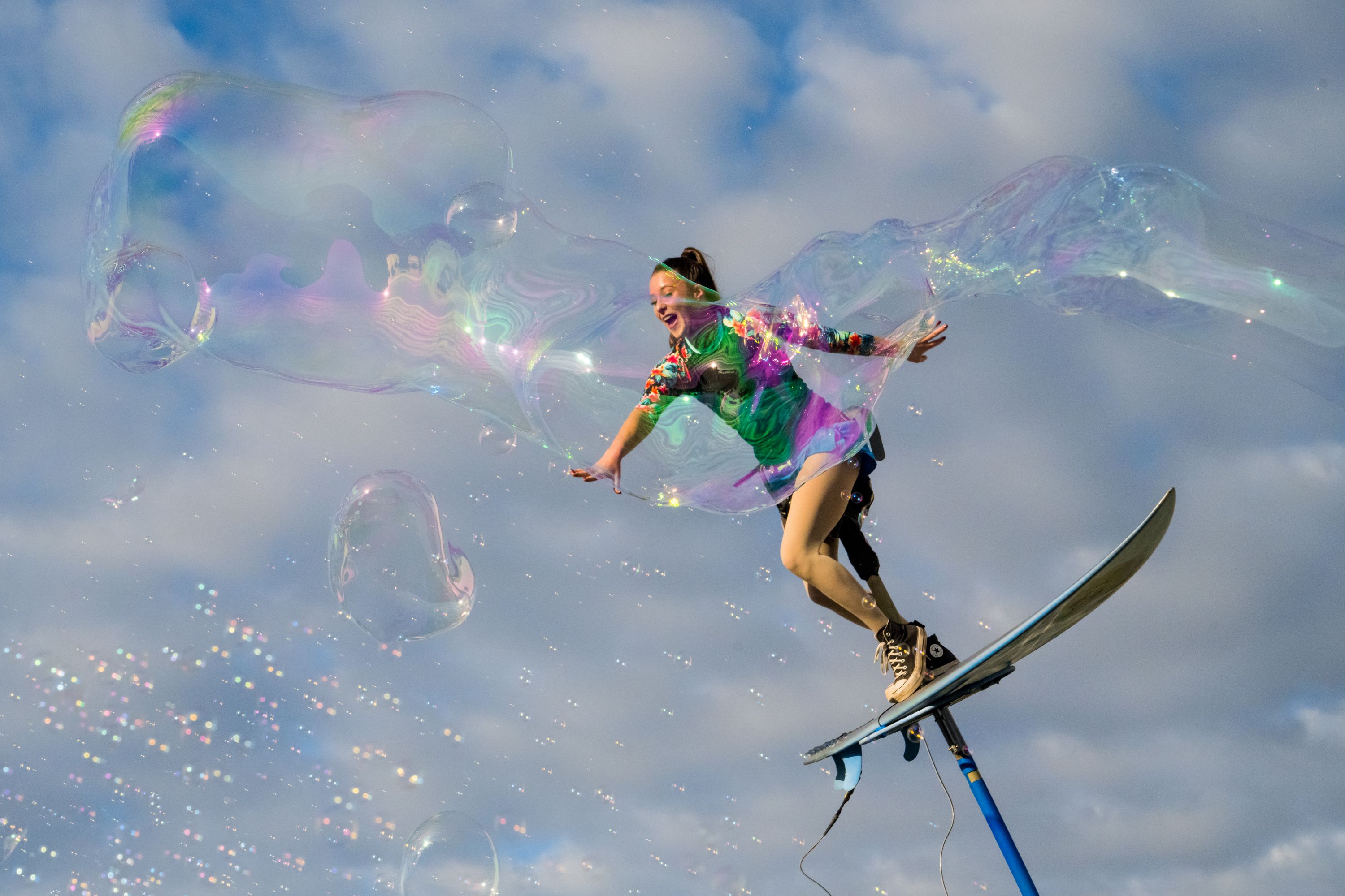 Überraschen Sie alle Altersgruppen mit einer schwerkrafttrotzenden Schwankstangennummer, die über ihren Köpfen taucht und schwebt. Sie ist der ideale Blickfang in großen Menschenmengen!