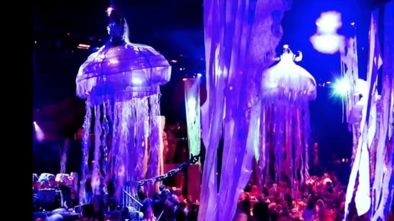 Am Ende einer spektakulären Luftakrobatik-Performance lässt jede Qualle ihre wunderschöne Meerjungfrau frei, bevor sie wieder nach oben steigt und mit einem bezaubernden farbenfrohen Glühen die Dekoration für die ganze Nacht bildet.