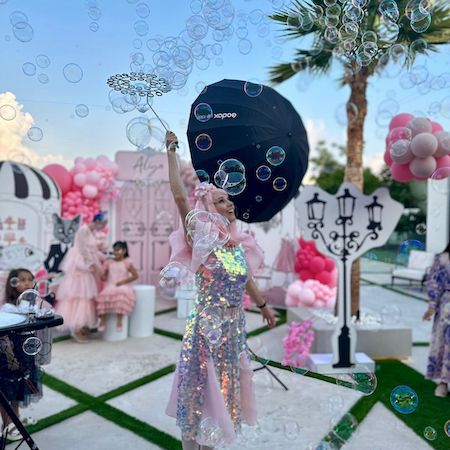 Mit Sitz in Dubai bringt diese Seifenblasenkünstlerin eine magische Atmosphäre zu privaten und geschäftlichen Veranstaltungen in den VAE und im Nahen Osten.