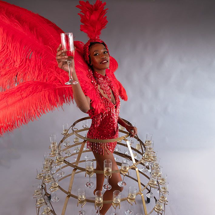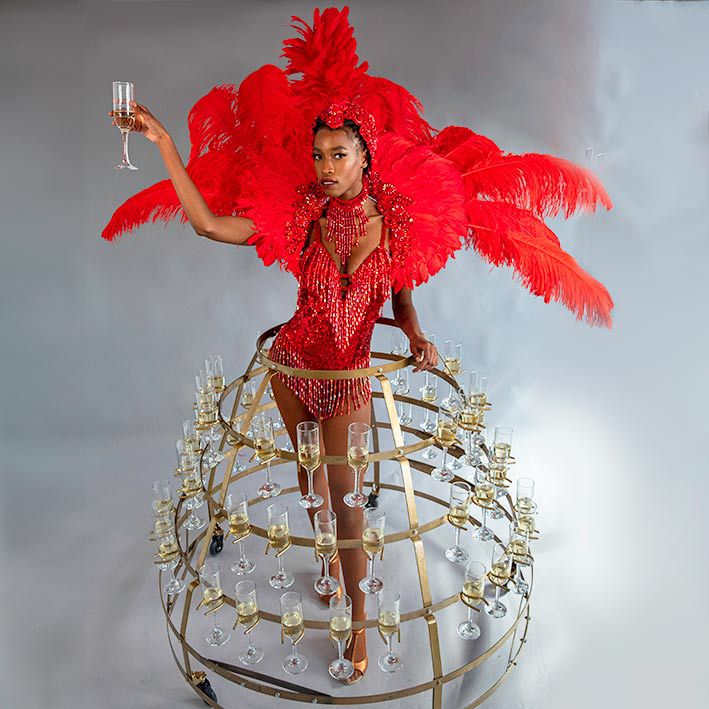 Geschmückt mit handgefertigten Blumen und einer beeindruckenden Kostümstruktur, die vollständig aus einzelnen Champagnerflöten besteht und direkt vom Kleid selbst genommen werden kann, ist unsere sensationelle Champagnerkleid-Show ein beliebter Luxus-Eventfavorit.