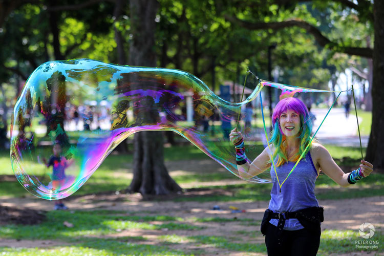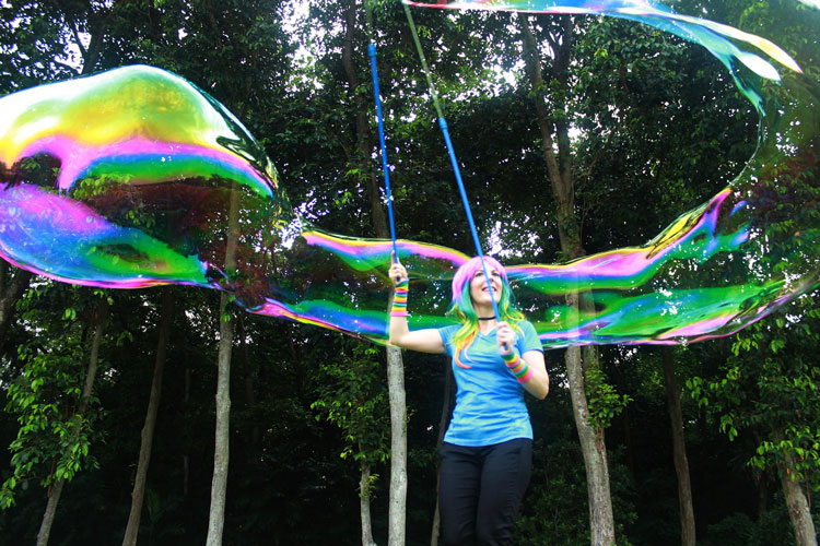 Unser Bubble-Performer in Singapur kann als Soloperformance gebucht werden, bei der sie mit allen interagiert, sowie als Bubble-Workshop, bei dem Kinder und Teilnehmer lernen, ihre eigenen riesigen Seifenblasen zu erstellen.